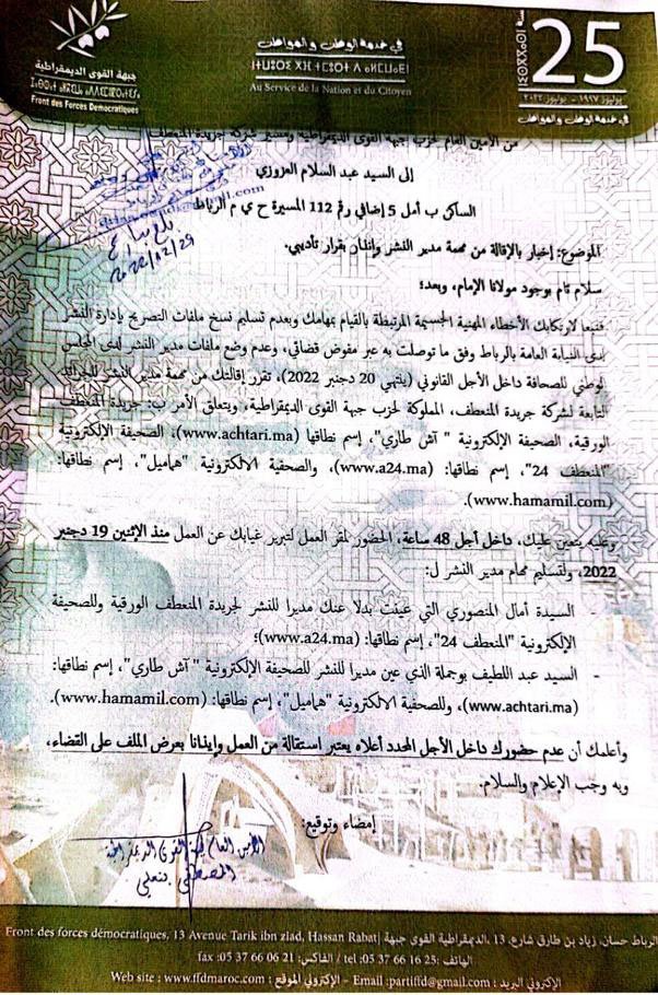 توصلت برسالة عن طريق المفوض القضائي صباح يوم الخميس 29 دجنبر2022 من الامين العام لحزب جبهة القوى الديمقراطية، ومسير شركة جريدة المنعطف (المصطفى بنعلي) مفادها، (كما تشير الوثيقة المرفقة مع هذا البلاغ)، أن هذا الأخير يخبرني في الموضوع: بالإقالة من مهمة مدير النشر، وإنذار بقرار تأديبي.