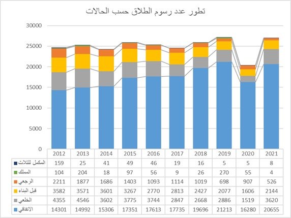 و بحسب معطيات الوزارة، عرفت باقي أنواع الطلاق تراجعا،خلال السنوات الممتدة من 2012 إلى 2021، بحيث أظهرت الوزارة أن حالات الطلاق الرجعي تراجعت من 2211 حالة سنة 2012 إلى 526 حالة سنة 2021.