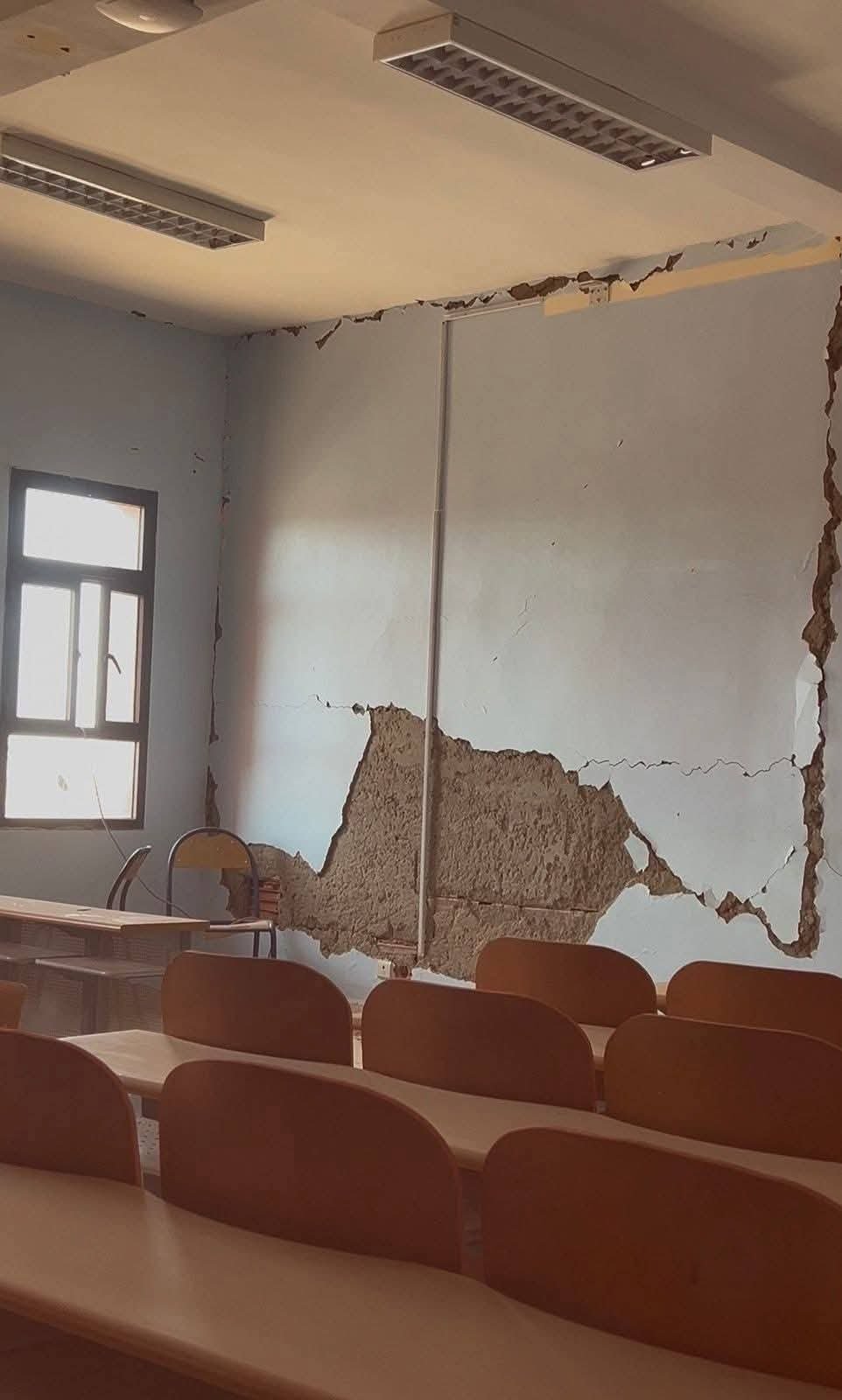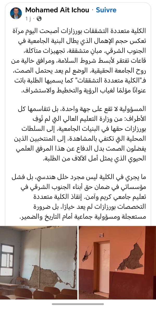 وحملت التدوينة مسؤولية وضع الكلية لعدة أطراف، من بينها وزارة التعليم العالي التي لم توفر لبنية الجامعة ما يتناسب مع حاجات المنطقة. والسلطات المحلية التي اكتفت بالمشاهدة، والمنتخبين الذين “يفضلون الصمت بدل الدفاع عن هذا المرفق العلمي الحيوي”. حتى صار الطلبة يصفون المؤسسة بـ”الكلية متعددة التشققات”، لكونهم صاروا يعيشون حالة من الإحباط أمام غياب مبادرات فعلية للإنقاذ.